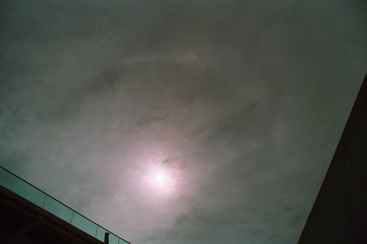 coronae, under a partly cloudy sky. As the Sun passed through transparent