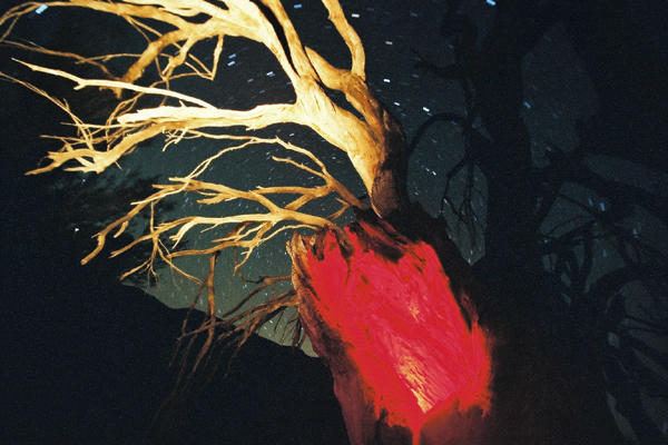 Mountains. The tree was illuminated with a powerful flashlight during a