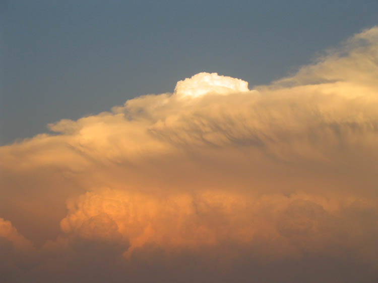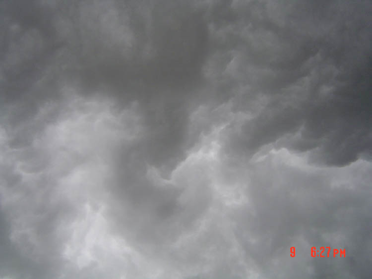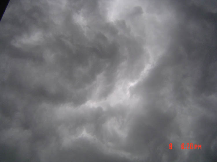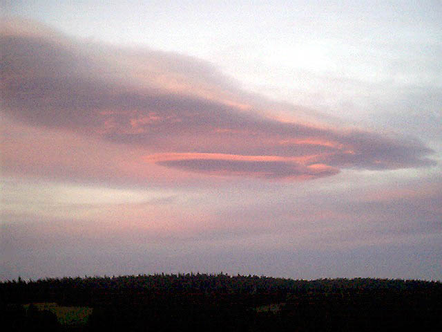 in Center Valley, WI, just before sunset on 2004//06/13. Though it looks like a severe weather system, that is not necessarily the case with this type of cloud. "We thought it looked like an alien spaceship ready to scoop us all up!"e-mail to: Austin Loveless |