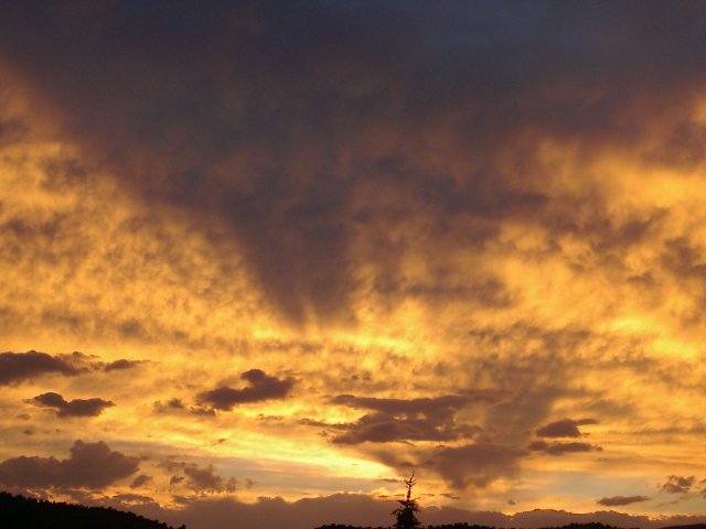 The hill behind our house blocks our view to the Westernhorizon and makes viewing dramatic sunsets a rarity from our vantage point. But on some evenings there's just too much sunset and, much to our delight, it spills over into our valley. 8-27-02 Camera: Olympus C-700 Digital on Auto setting, ISO 100. e-mail to: Karl J. Kuehn - Greene, NY |
