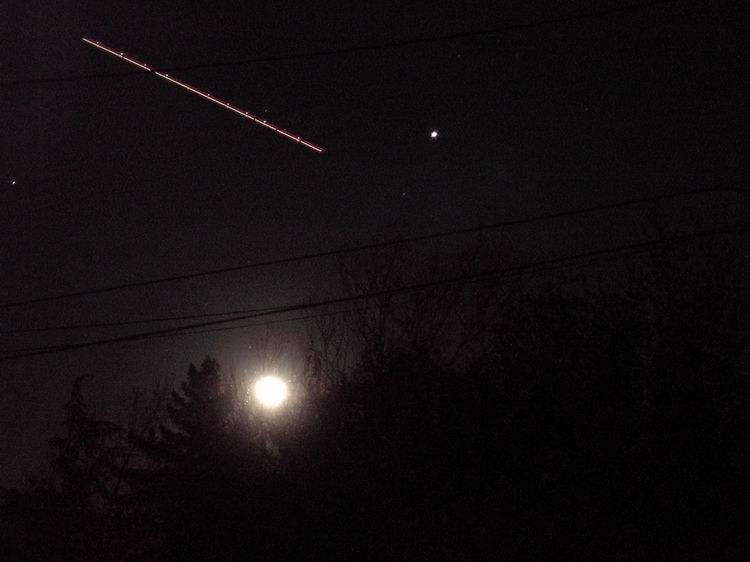 Venus during sunset over Portage Lake in Pinckney, Michigan."The orange stripe going 4/5 the way across the photo from left to right is the running lights on a pontoon boat crossing the lake." Pentax 35mm on Kodak Royal Gold 400 color print film. 30 sec exp e-mail to: Mike Hutchinson - Muncie, Indiana |