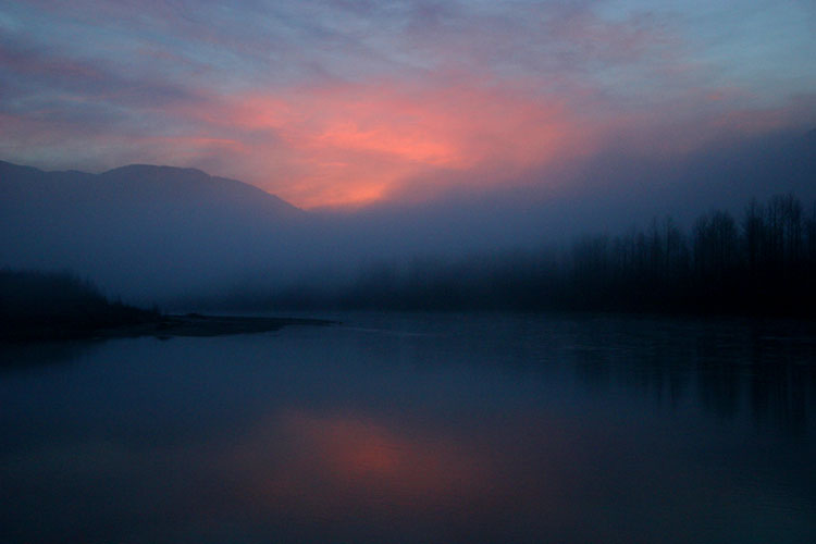 Photo of this morning's (Oct 18, 2003) sunrise over the Skagit River in northwest Washington State, USA. Taken with an Olympus C-730 Ultra Zoom digital camera, and underexposed 1.3 stops from the metered reading.e-mail to: Wade B Clark Jr |
