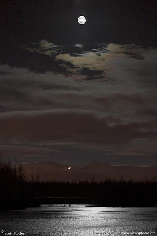 from nearly everywhere in Anchorage.I've also included a second photo that is a close-up crop of the overall photo. It clearly shows the star and the moonlight shining on the frozen surface of the lake. See more photos by: Scott McGee - Anchorage, Alaska |