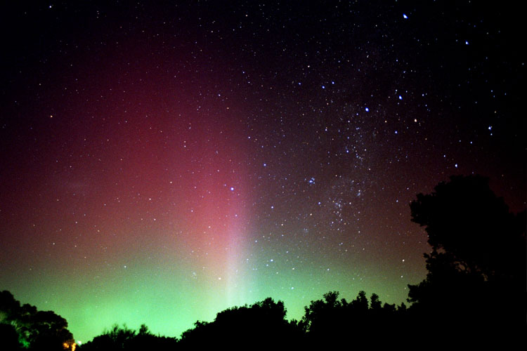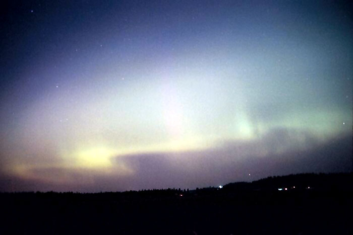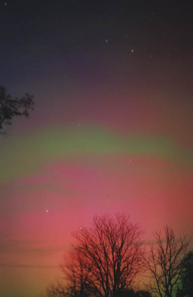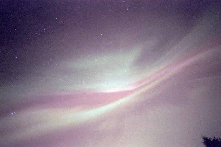 2004/01/25 brief auroral display at 01:00. The temp was around 0 degrees in Two Rivers, WI. This bright curtain shot across the horizon, and faded again 15 minutes later. I was lucky enough to be driving through a rural area with a camera & tripod handy. Canon G2 digital, ASA 400, f 2.0 for 15 sec.See more photos by: Peg Zenko |