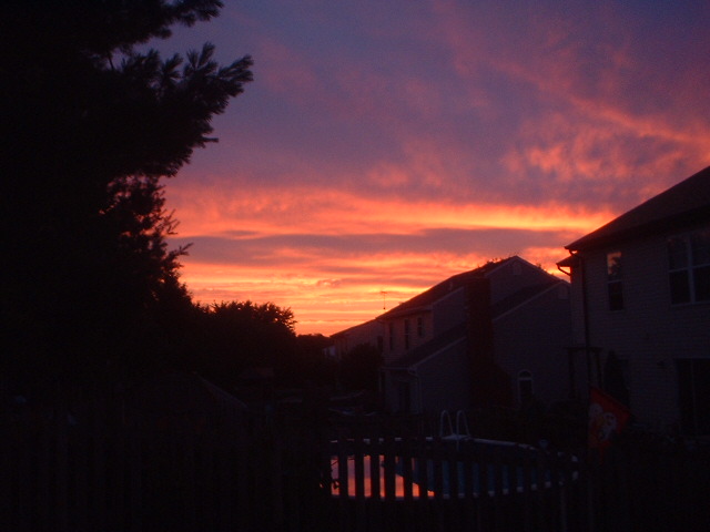 This is a picture of the sunrise at 5:45am taken from my back yard. I stayed up all night the night before and took this shot. There is a nice reflection off of the pool here as well. Allison Casalena Baltimore, Maryland. |