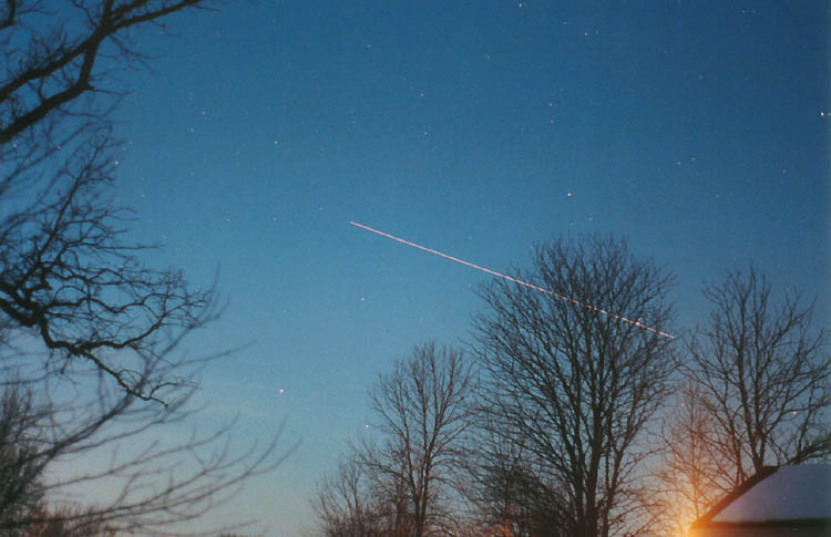 Venus during sunset over Portage Lake in Pinckney, Michigan."The orange stripe going 4/5 the way across the photo from left to right is the running lights on a pontoon boat crossing the lake." Pentax 35mm on Kodak Royal Gold 400 color print film. 30 sec exp e-mail to: Mike Hutchinson - Muncie, Indiana |