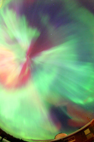I took this on Oct. 29th at about 1 am. I watched all night the glow to the north, then about 12:30- 1 am it picked up and erupted with reds as bright as brake lights all over the sky, including in this corona overhead.Chrisinda Bowlin - Metaline Falls, Washington, USA |