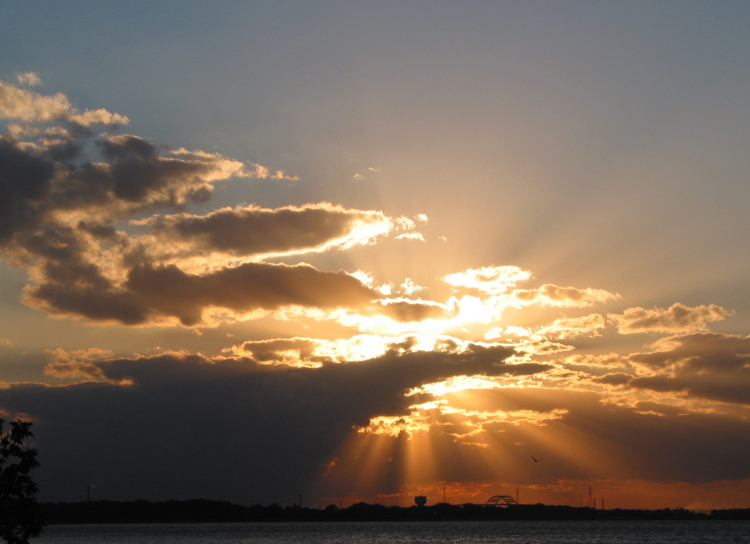 "Cloudburst" of evening crepuscular rays over the water of Green Bay. Taken with a Canon G2 digital on 2003/09/24.e-mail to: Peg Zenko - Green Bay, WI USA |
